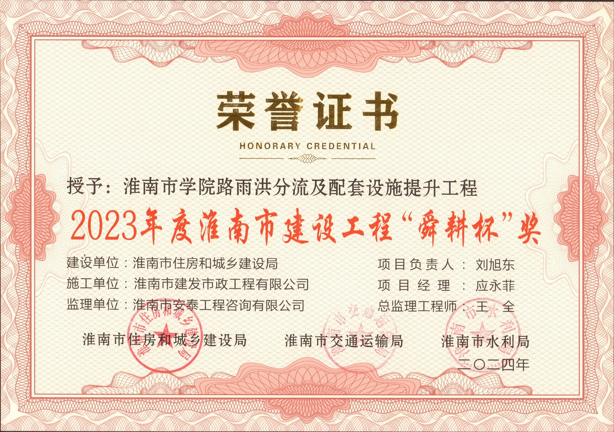 近日,由我公司承建的淮南市學(xué)院路雨洪分流及配套設(shè)施提升工程,榮獲2023年度淮南市“舜耕杯”優(yōu)質(zhì)工程獎。該獎項是淮南市建設(shè)工程質(zhì)量最高榮譽獎。